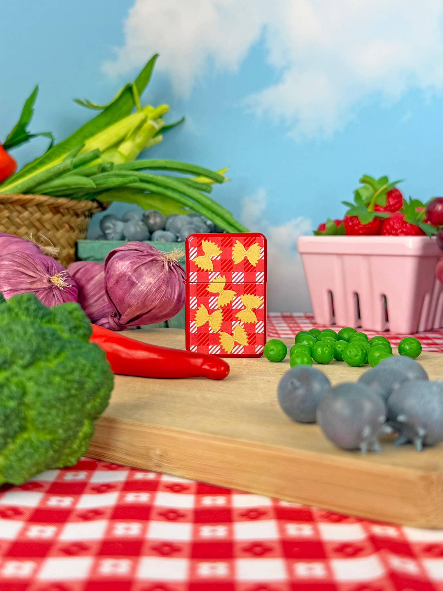 Can you tell we were hungry when we designed this lighter?? This red gingham lighter features an all over farfalle...