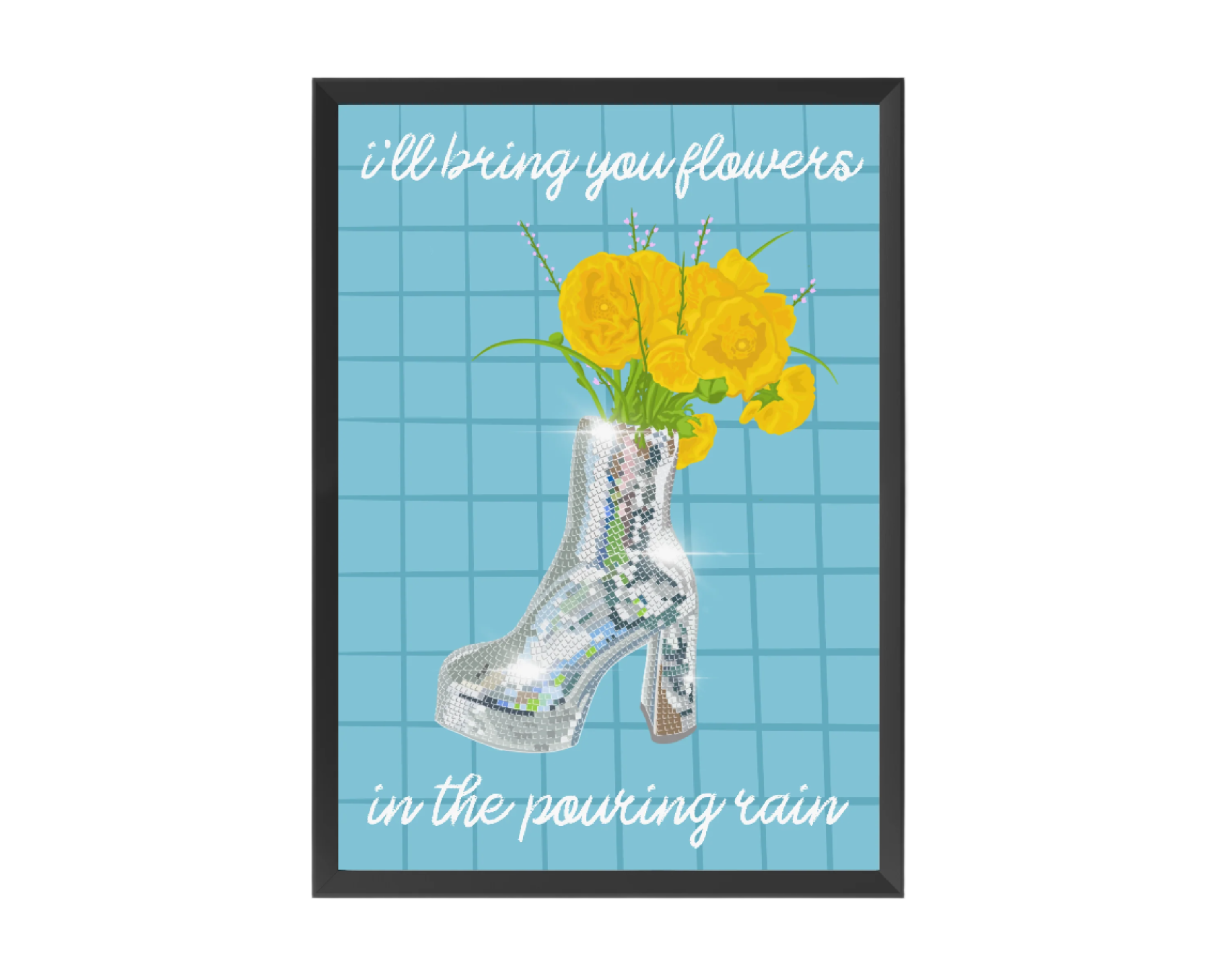 This trendy art print states I'll Bring You Flowers In The Pouring Rain with a disco high heel vase showcasing...