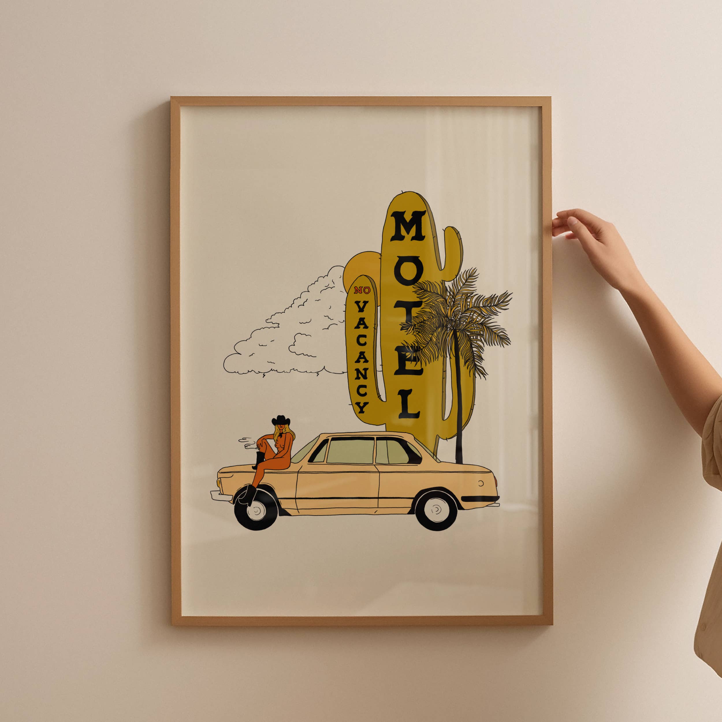 A western-inspired print of a cowgirl sitting on the hood of her car smoking a cigarette as she contemplates where...