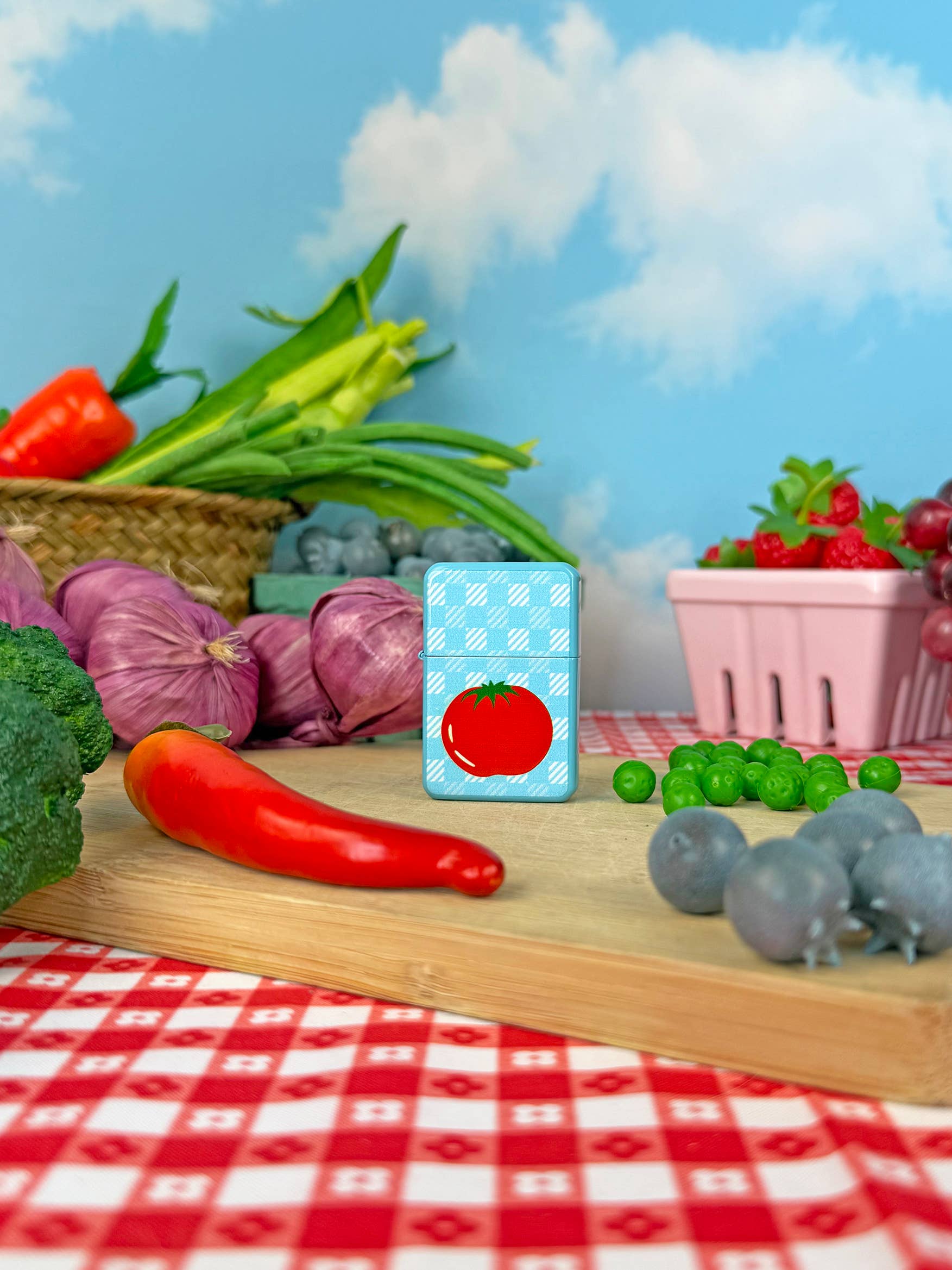 Picked straight from the Burning Love garden! This blue gingham lighter features a cutie little red tomato with a green...