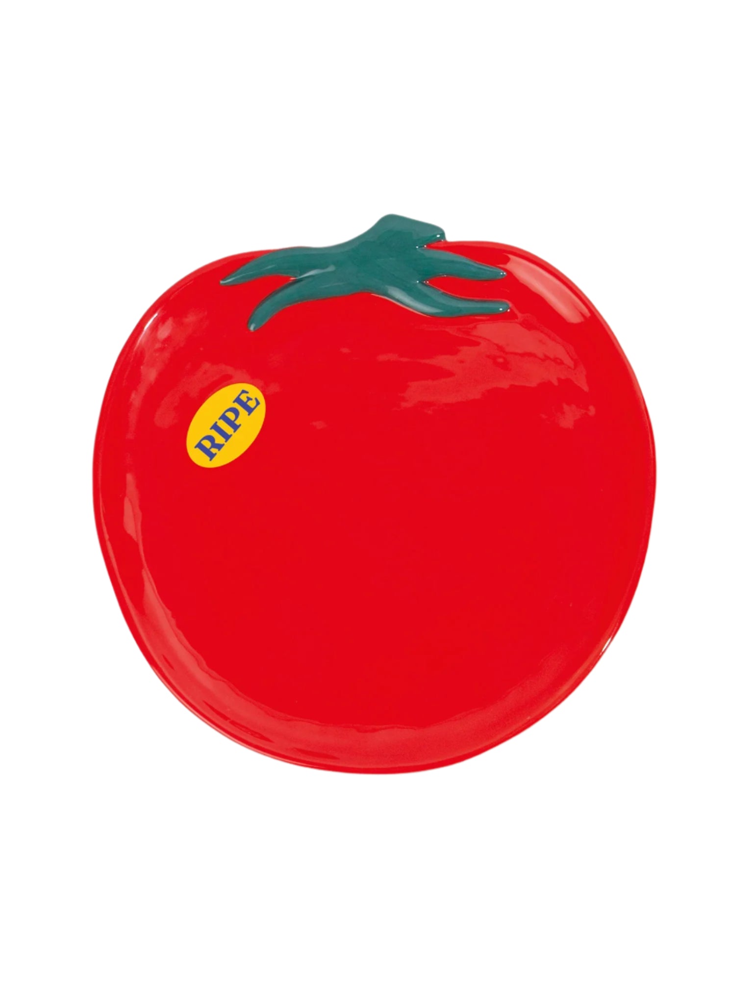 A ceramic plate, crafted in the shape of a tomato, captures the lively essence of a farmer's market with its...