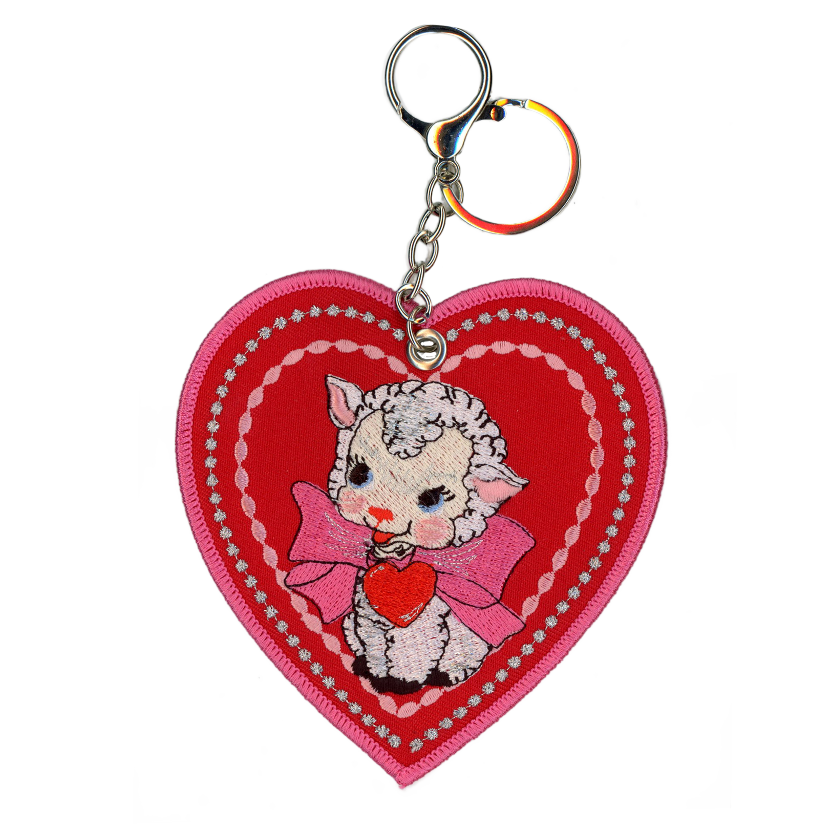 4.25” tall x 4” wide x .125” thick Embroidered patch charm. Double sided embroidered. Attached split key ring and dog...