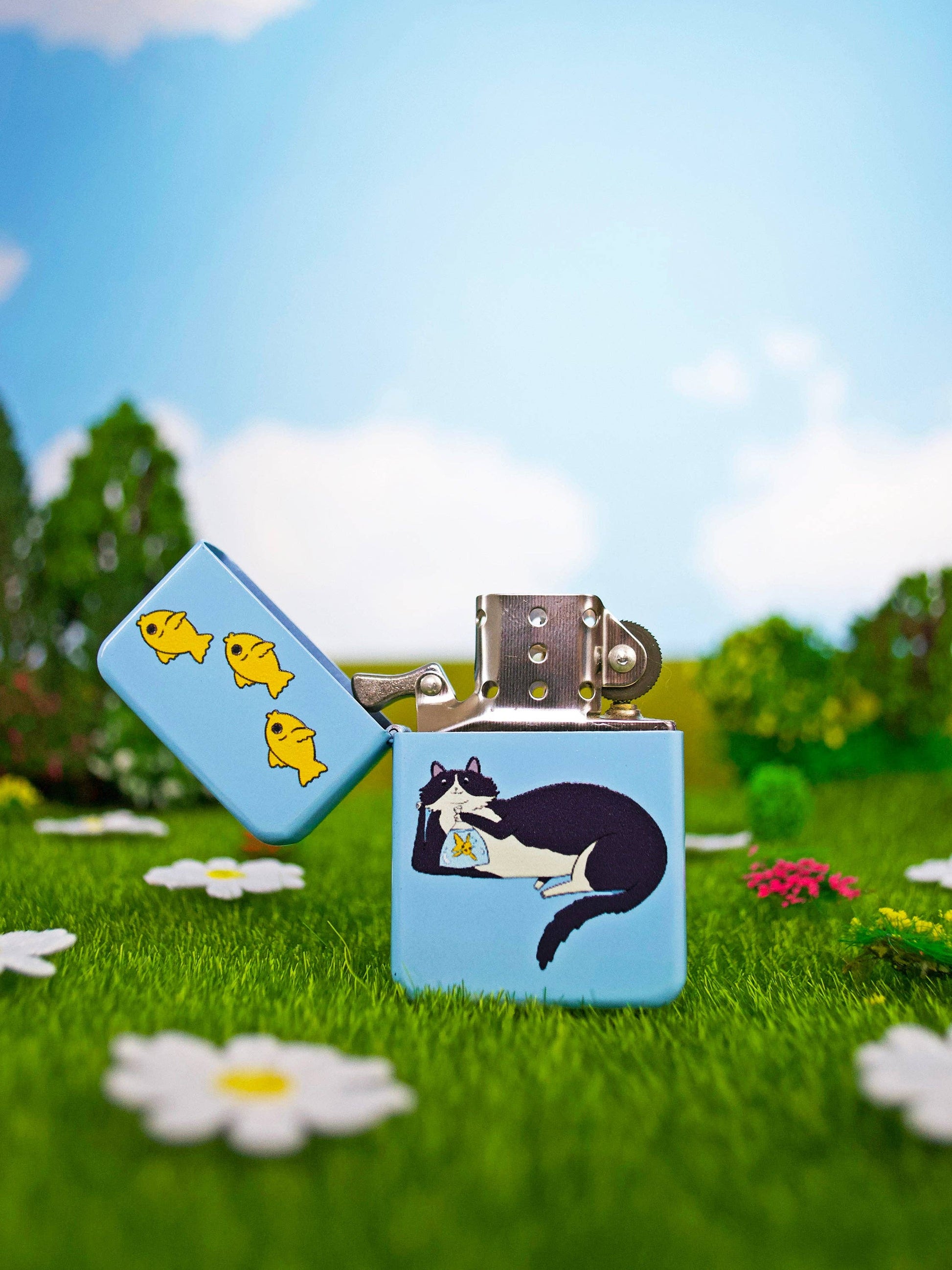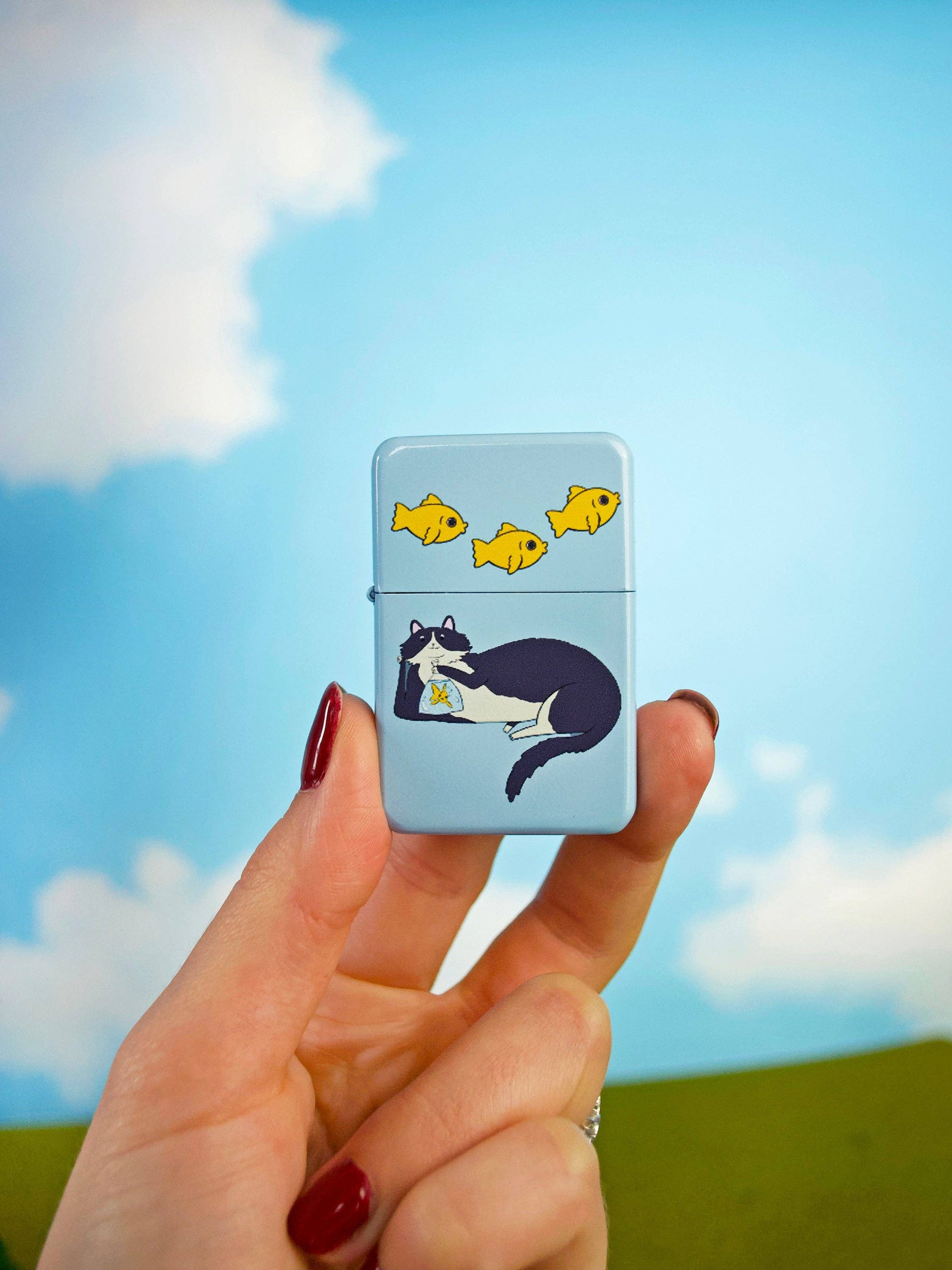 Love cute cat designs? This refillable metal lighter features a playful black-and-white kitty lounging with its fish friends—whether they’re companions or a snack is up to you! The light blue metallic finish has a subtle glittery shine, making this durable, reusable lighter both stylish and fun.
