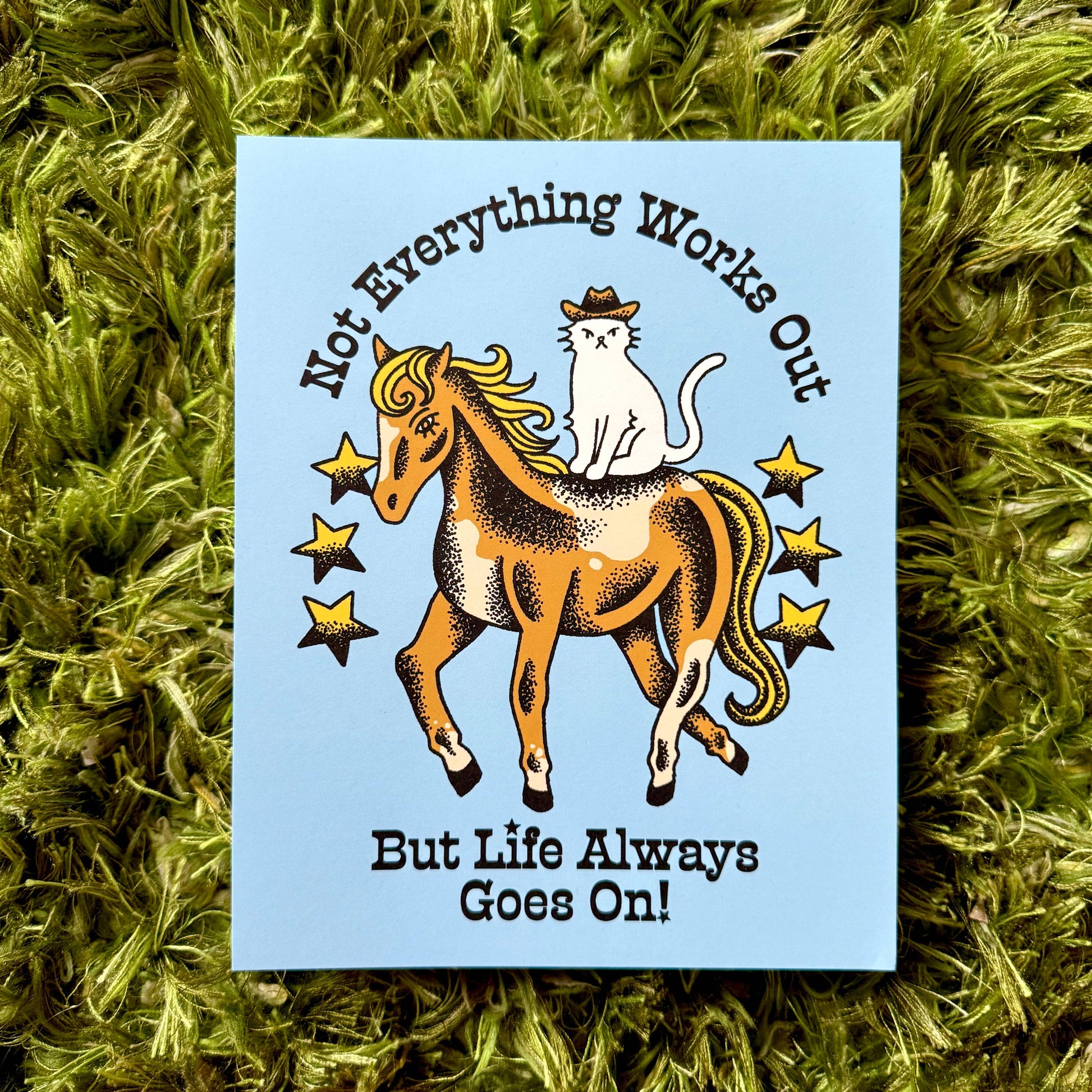 Our 'Life Goes On' print by Ren-O-Graphics is an expressive addition to your home decor. It's an 8" x 10" matte print, thoughtfully created on heavy cardstock to ensure durability. This art print is a reflection of our Midwest-based graphic designer's passion for illustration. It's an ideal piece to add to any wall decor. Please ensure to handle with care and keep it dry to maintain its quality.