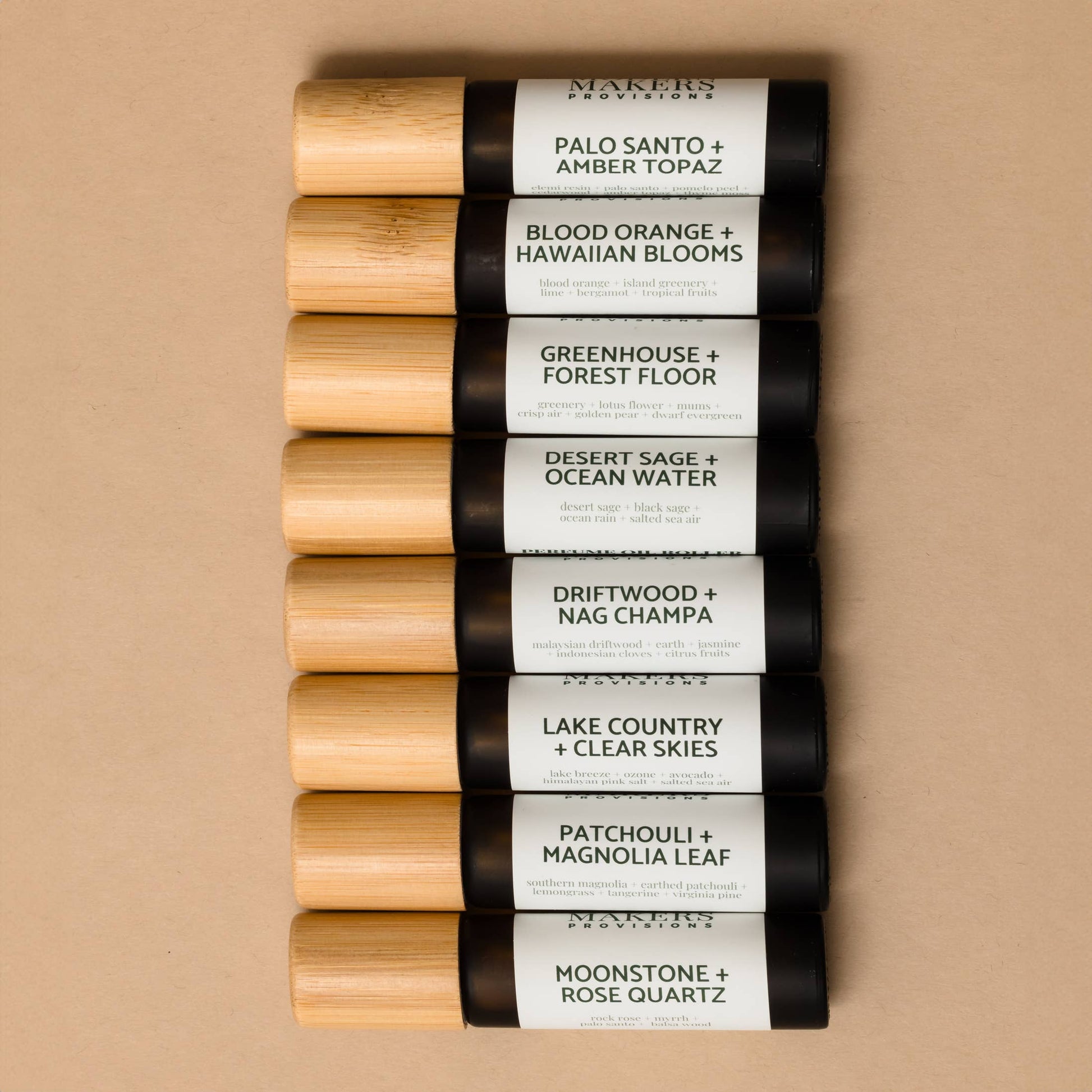 Palo Santo + Amber Topaz has scented notes of elemi resin + palo santo + pomelo peel + cedarwood + amber topaz + thyme moss. This is a complex scent that is both woody + smoky with a hint of sweet moss. This rugged scent is both soothing + recharging as it offers up notes that fit perfectly with one another!